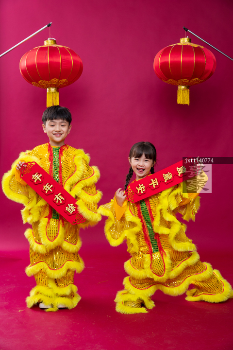图片标题: 舞狮子的男孩女孩庆祝新年