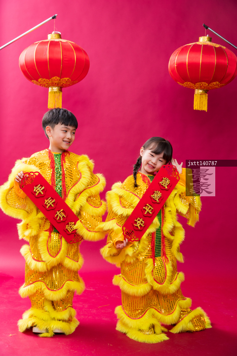 图片标题: 舞狮子的男孩女孩庆祝新年