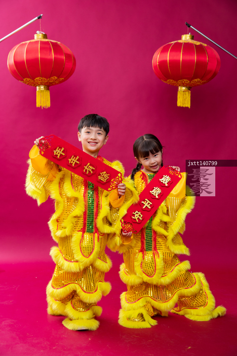 图片标题:     舞狮子的男孩女孩庆祝新年