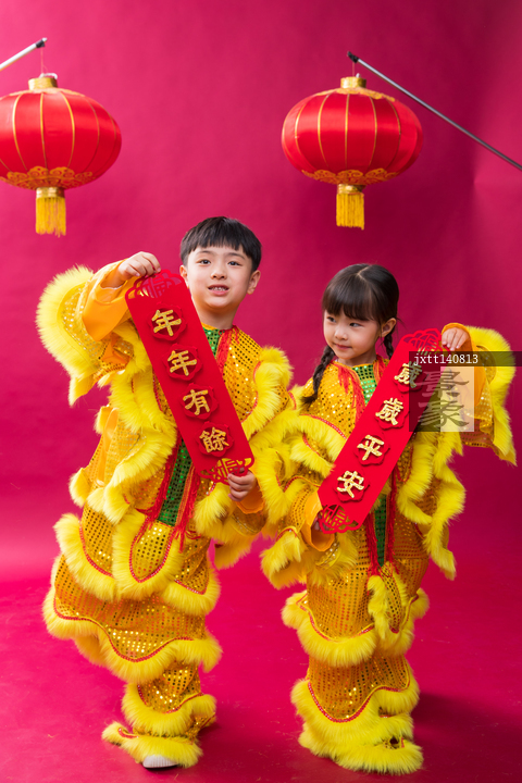 图片标题: 舞狮子的男孩女孩庆祝新年