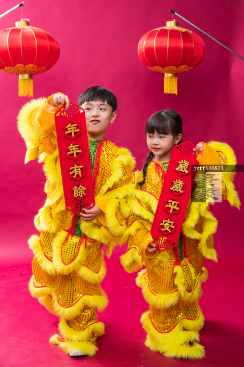 图片标题: 舞狮子的男孩女孩庆祝新年