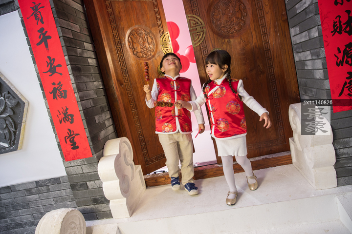 图片标题: 可爱的男孩女孩在门口吃糖葫芦