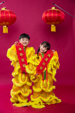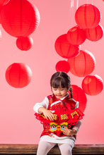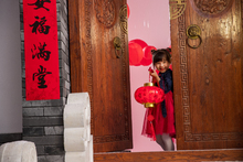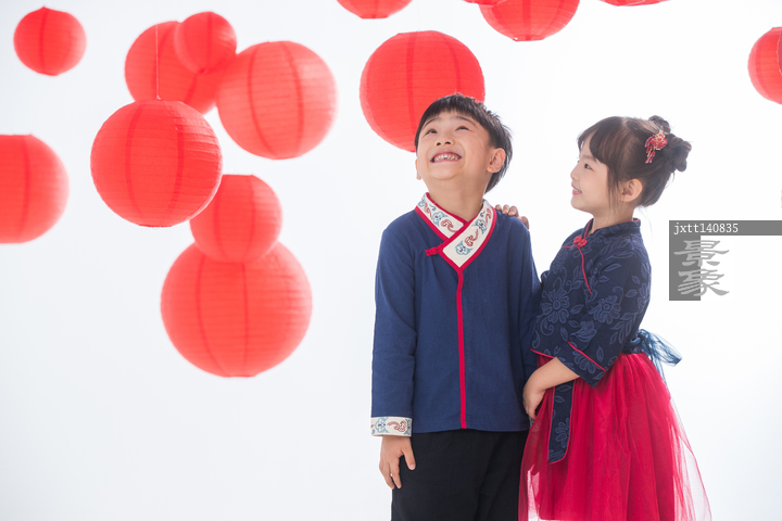 图片标题: 红灯笼下玩耍的快乐男孩和女孩