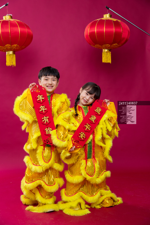 图片标题: 舞狮子的男孩女孩庆祝新年
