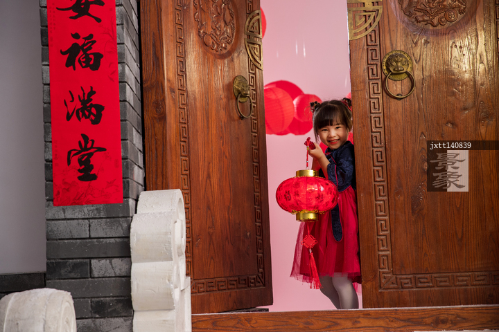 图片标题:     可爱的小女孩拿着红灯笼站在大门口