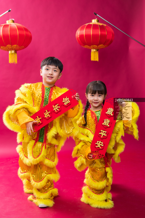 图片标题:     舞狮子的男孩女孩庆祝新年