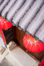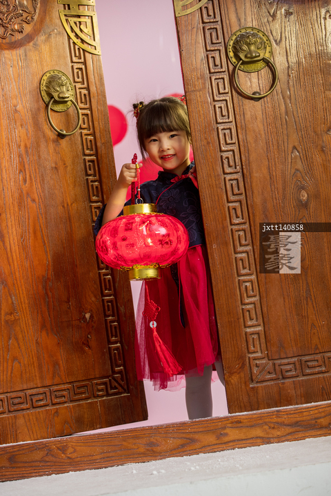 图片标题: 可爱的小女孩拿着红灯笼站在大门口