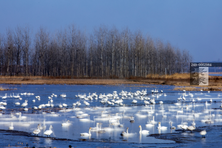 图片标题: 河南三门峡黄河湿地上栖息越冬的白天鹅
