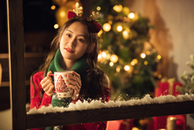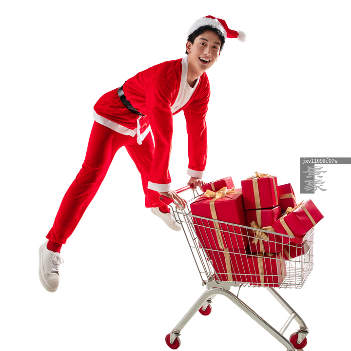 图片标题: 穿圣诞服的青年男人推着购物车