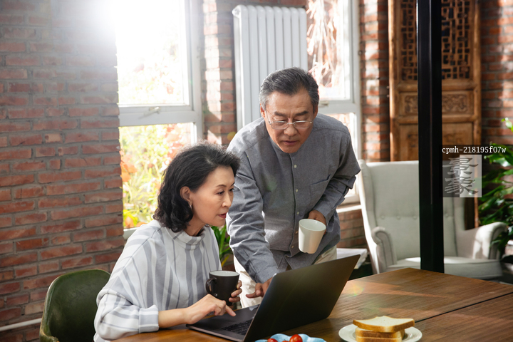 图片标题: 快乐的老年夫妇使用笔记本电脑