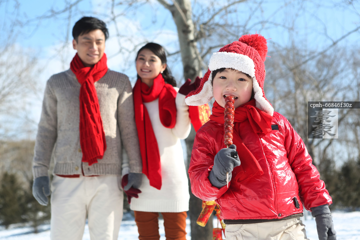 图片标题: 男孩拿着糖葫芦和父母在户外