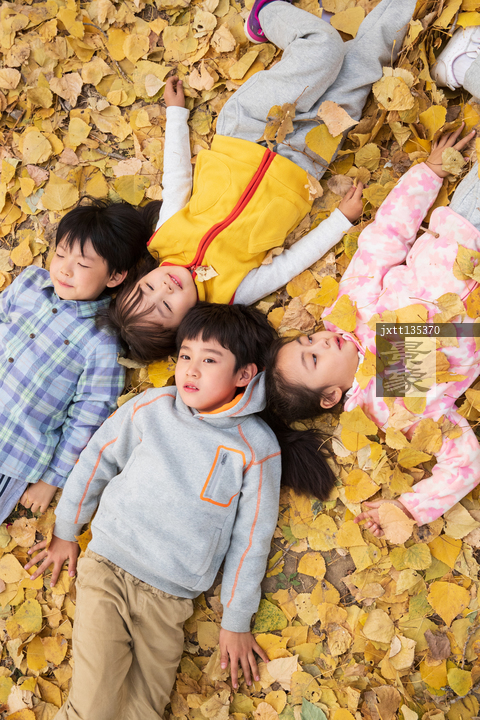 图片标题: 可爱的小朋友们躺在落叶上玩耍