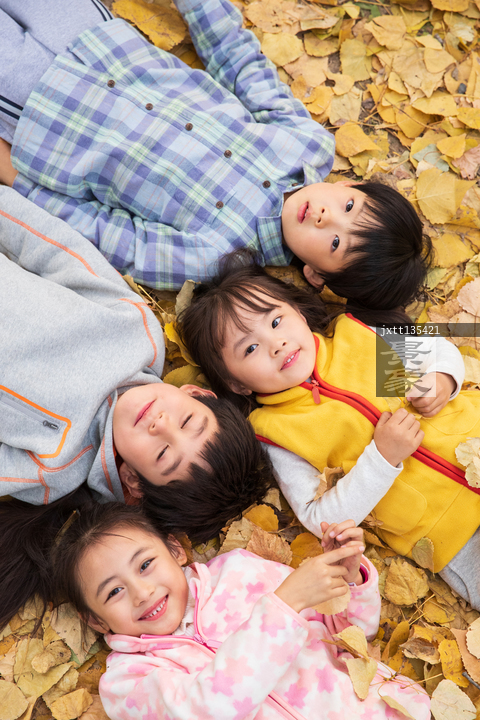 图片标题:     可爱的小朋友们躺在落叶上玩耍