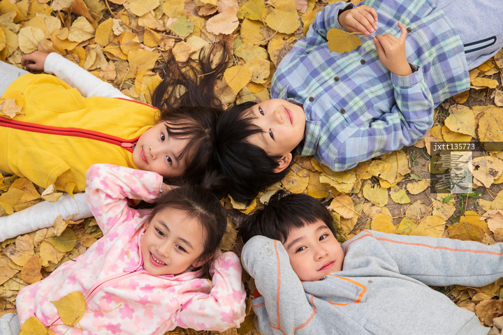 图片标题: 可爱的小朋友们躺在落叶上玩耍