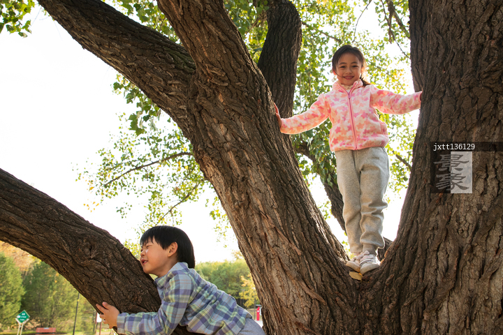 图片标题: 趴在树上的快乐儿童