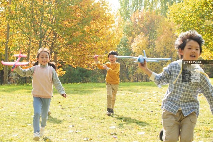 图片标题: 拿着玩具飞机在公园玩耍的快乐儿童