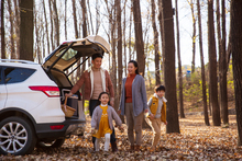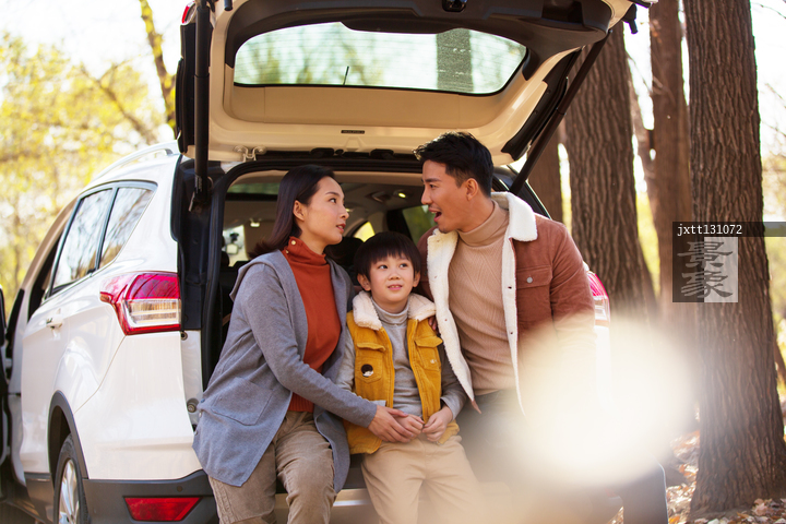图片标题: 一家三口坐在汽车后备箱里