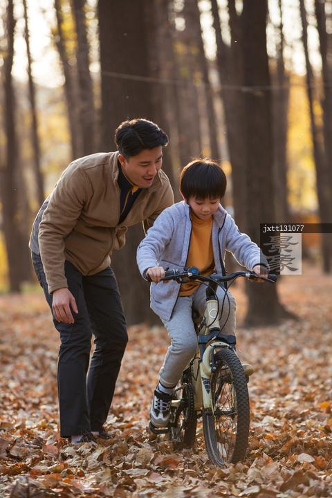 图片标题: 青年父亲教孩子骑自行车
