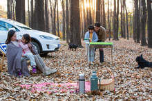 图片标题: 欢乐家庭在户外玩捉迷藏游戏