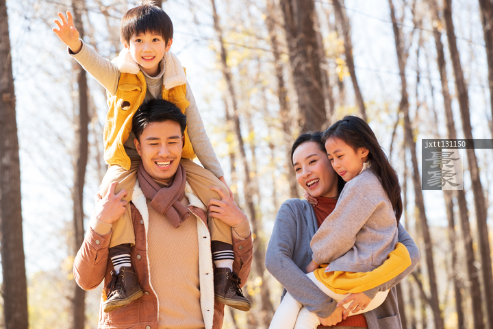 图片标题: 幸福家庭在树林里玩耍