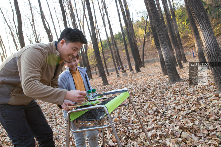 图片标题: 父亲和孩子在郊外烧烤