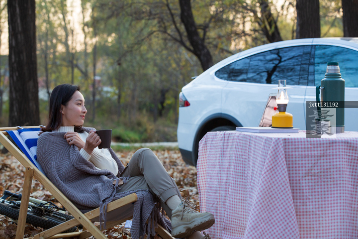 图片标题:     青年女人坐在户外喝水