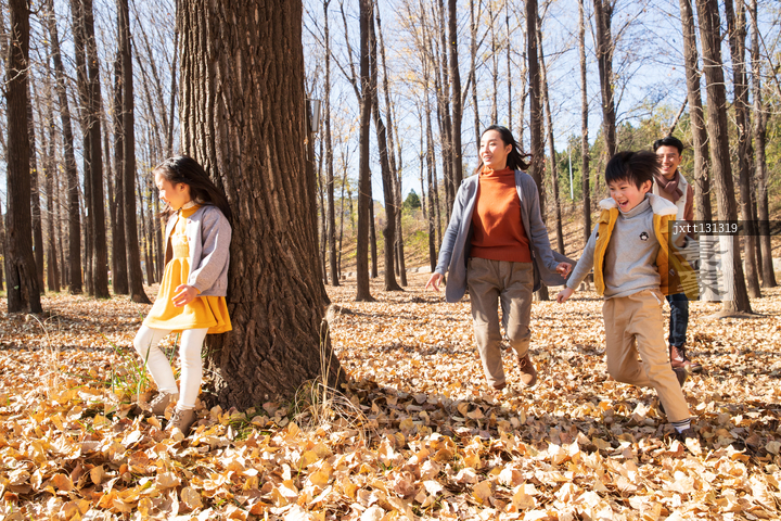 图片标题: 欢乐家庭在户外玩捉迷藏游戏