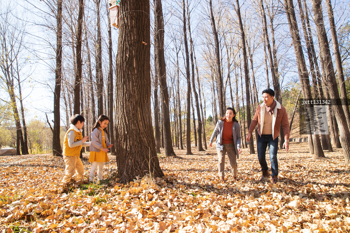 图片标题: 欢乐家庭在户外玩捉迷藏游戏