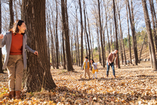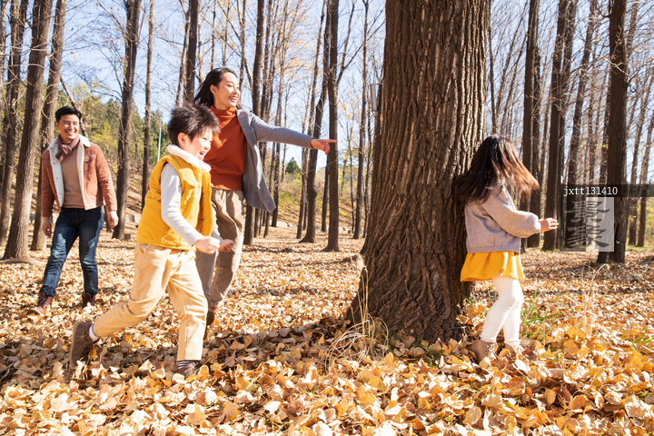 图片标题: 欢乐家庭在户外玩捉迷藏游戏