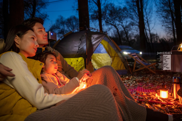 图片标题: 一家三口夜晚在野外露营