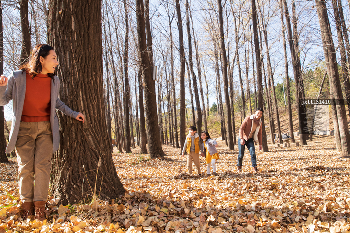 图片标题:     欢乐家庭在户外玩捉迷藏游戏