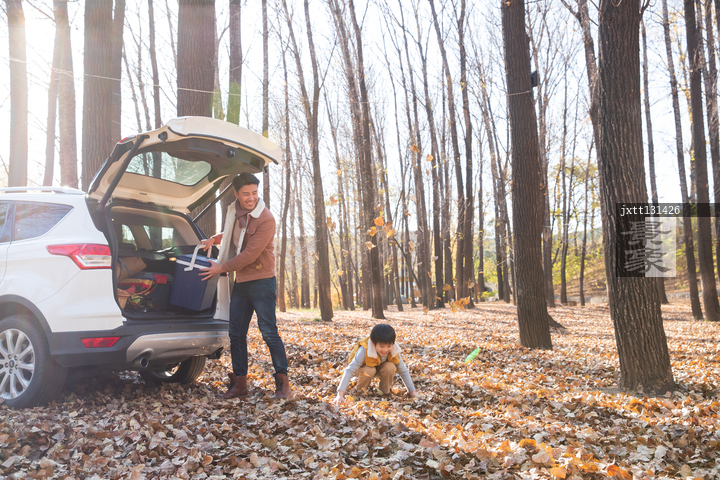 图片标题: 年轻父亲带着孩子驾车郊游