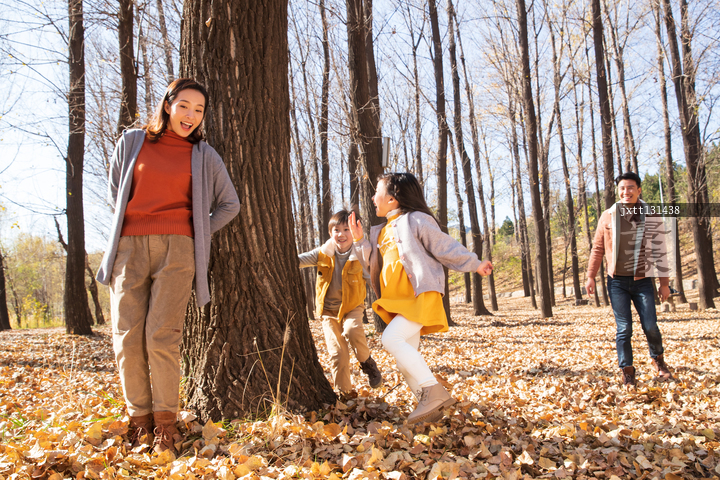 图片标题: 欢乐家庭在户外玩捉迷藏游戏
