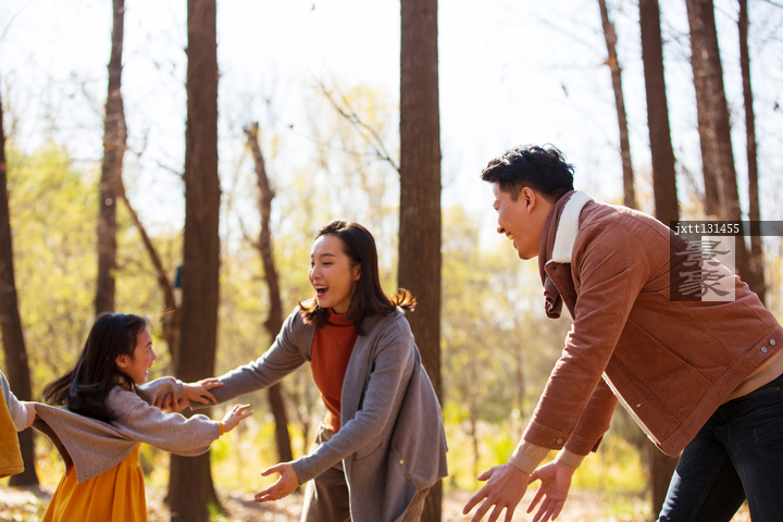 图片标题: 欢乐家庭在户外玩游戏