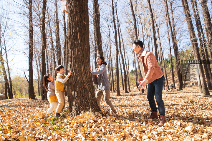 图片标题: 欢乐家庭在户外玩捉迷藏游戏