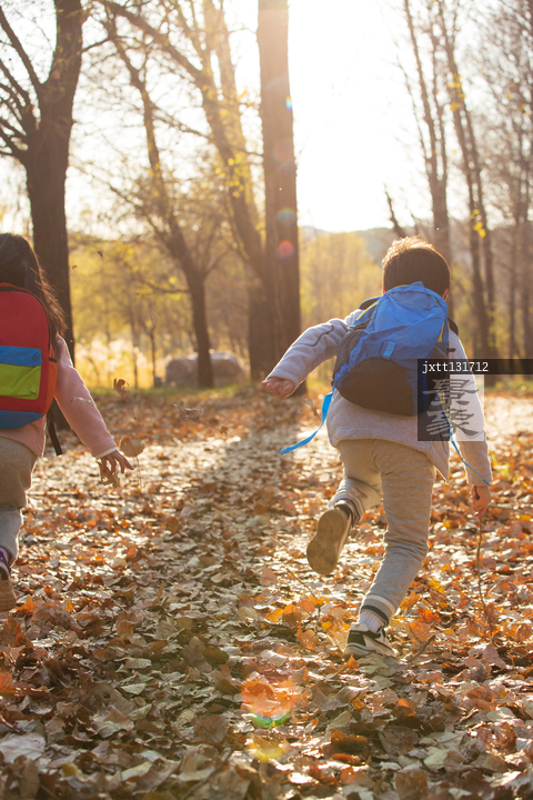 图片标题:     背着书包的小朋友在树林里徒步旅行