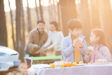图片标题: 快乐家庭在树林里玩耍