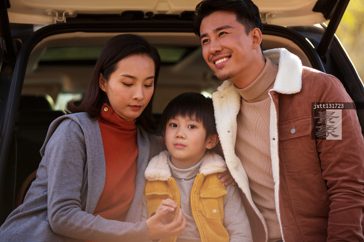 图片标题: 一家三口坐在汽车后备箱里