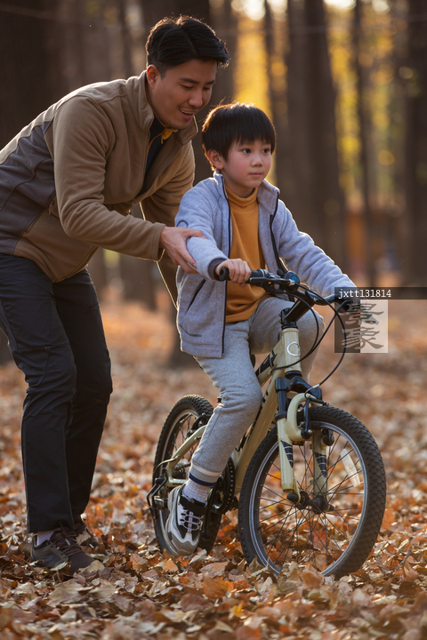 图片标题: 青年父亲教孩子骑自行车