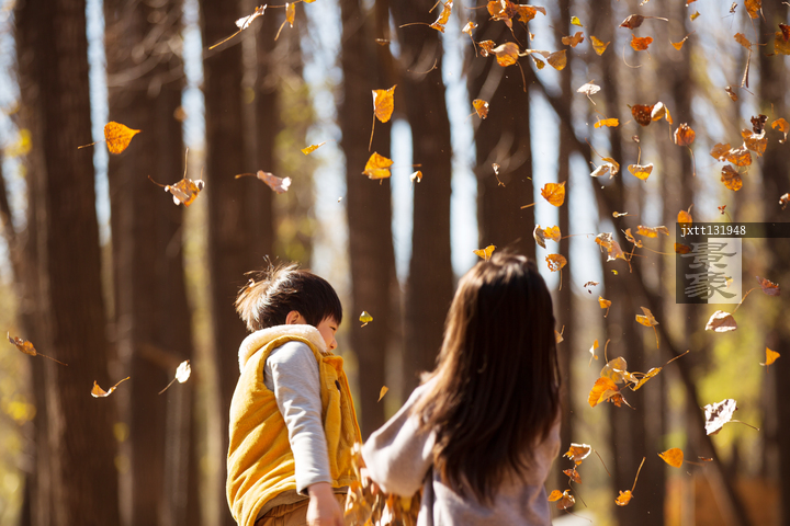 图片标题:     可爱的男孩女孩在树林里玩树叶