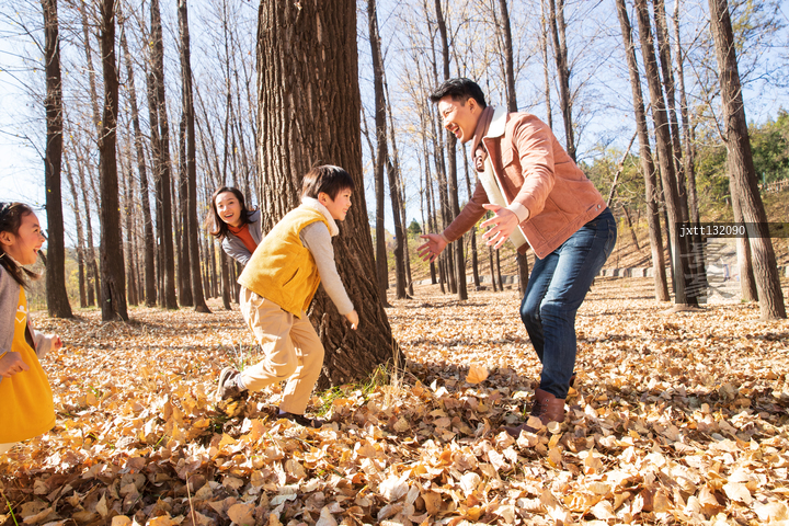图片标题: 欢乐家庭在户外玩捉迷藏游戏