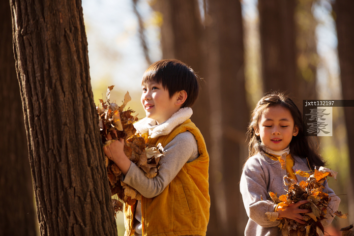 图片标题:     可爱的男孩女孩在树林里玩树叶