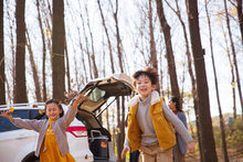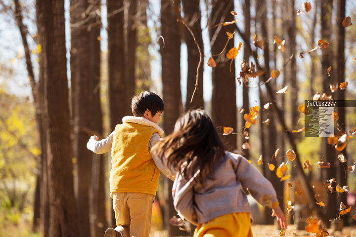 图片标题:     可爱的男孩女孩在树林里玩树叶