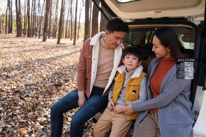 图片标题: 一家三口坐在汽车后备箱里