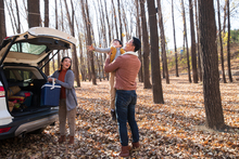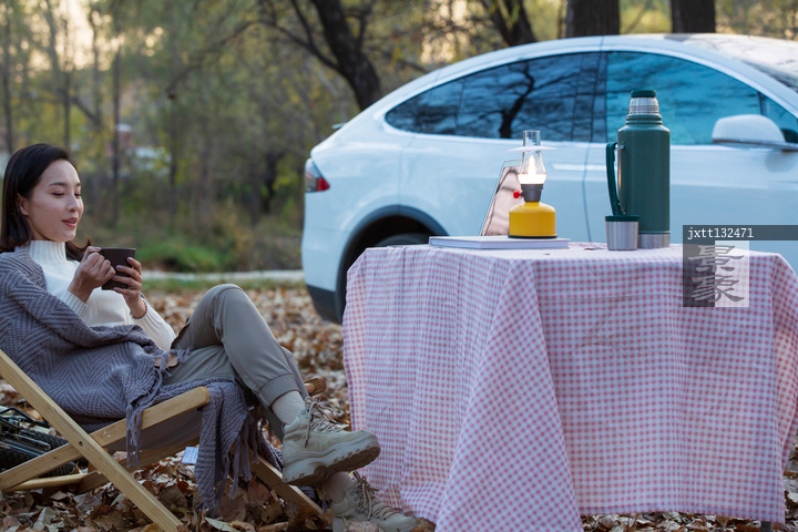图片标题: 青年女人坐在户外喝水