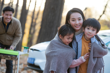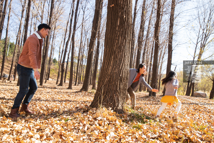 图片标题: 欢乐家庭在户外玩捉迷藏游戏