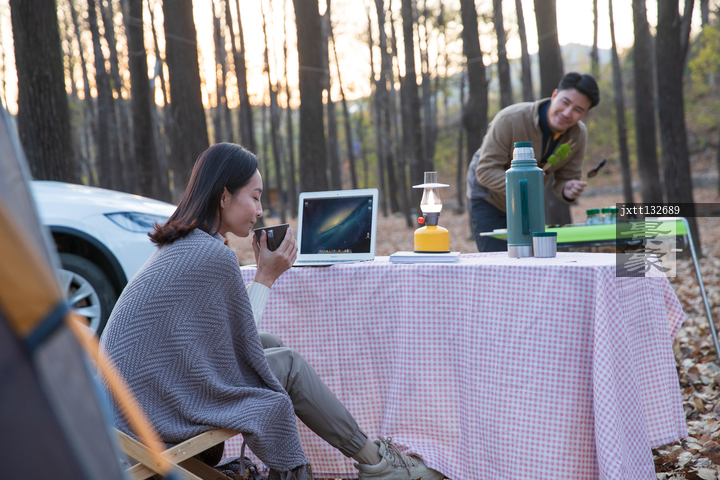 图片标题: 青年夫妇在野外露营
