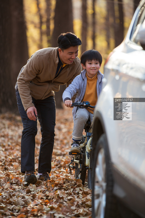 图片标题: 青年父亲教孩子骑自行车