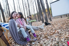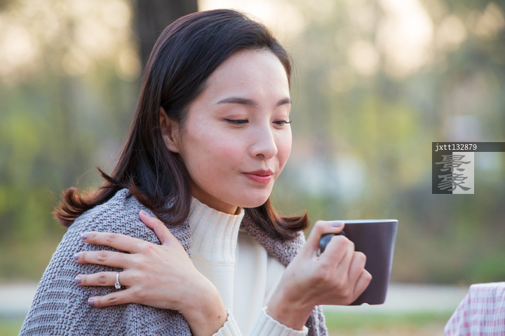 图片标题: 青年女人坐在户外喝水