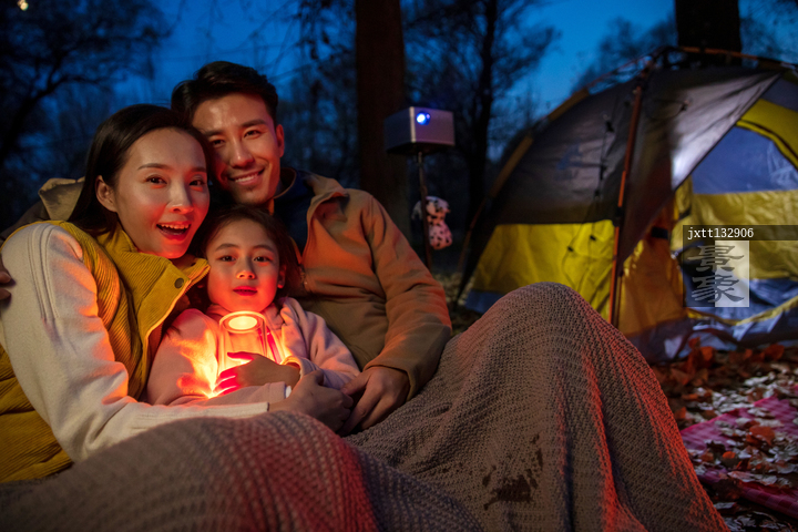 图片标题: 一家三口夜晚在野外露营